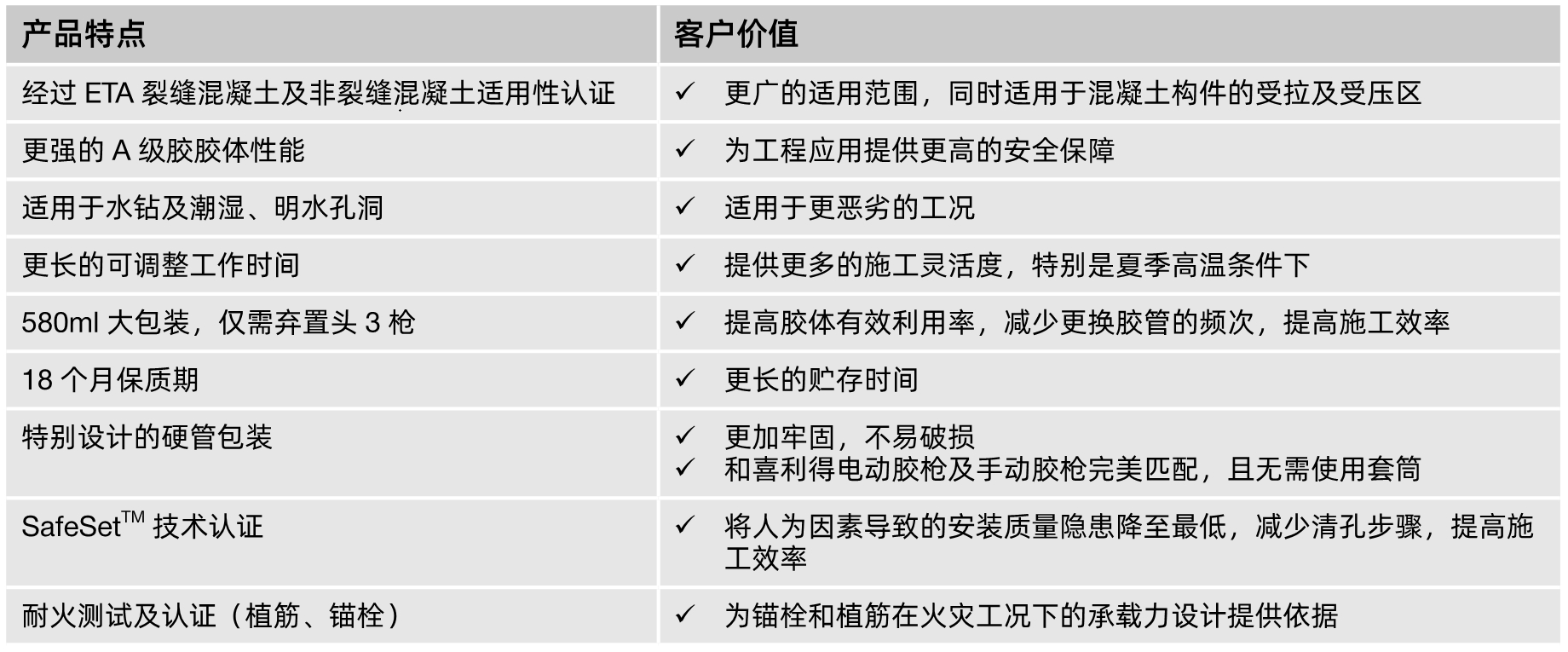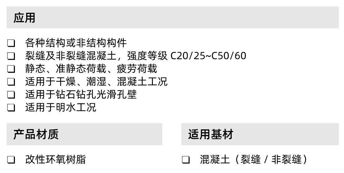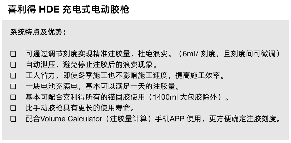 喜利得植筋膠用于混凝土結(jié)構(gòu)植筋加固,特別是重要,懸挑構(gòu)件,承重動力作用的結(jié)構(gòu),構(gòu)件等;特別是用于大直徑與埋深(如搭接)的植筋與緊固。